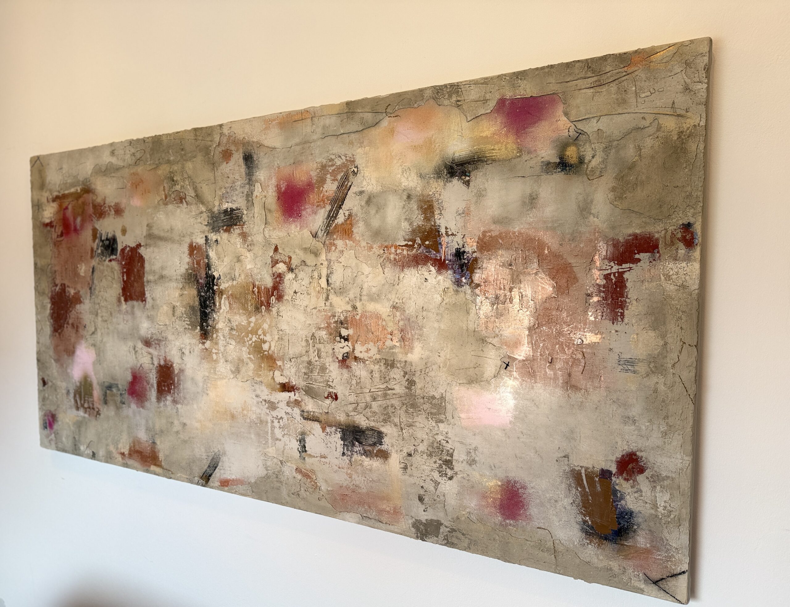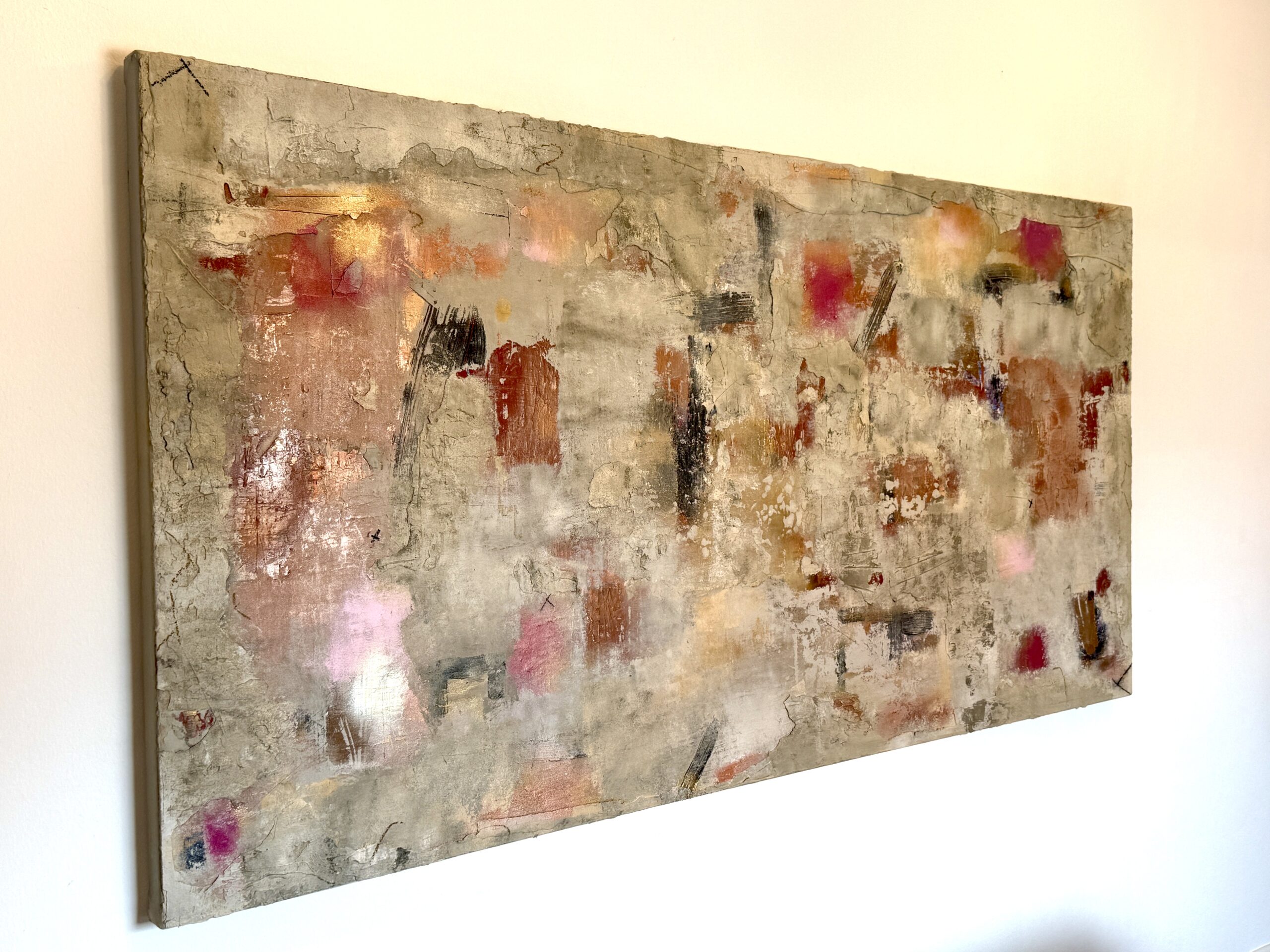 Acrylic, oil, chalk metallic spray and micro cement on canvas