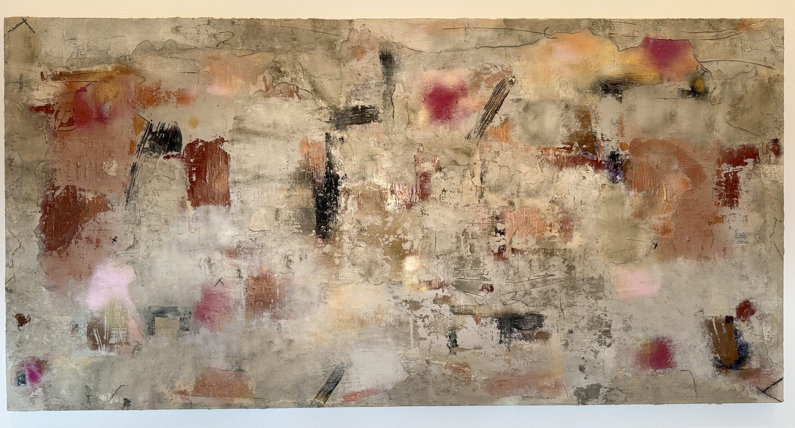 Acrylic, micro-cement, rose gold chicken wire on canvas